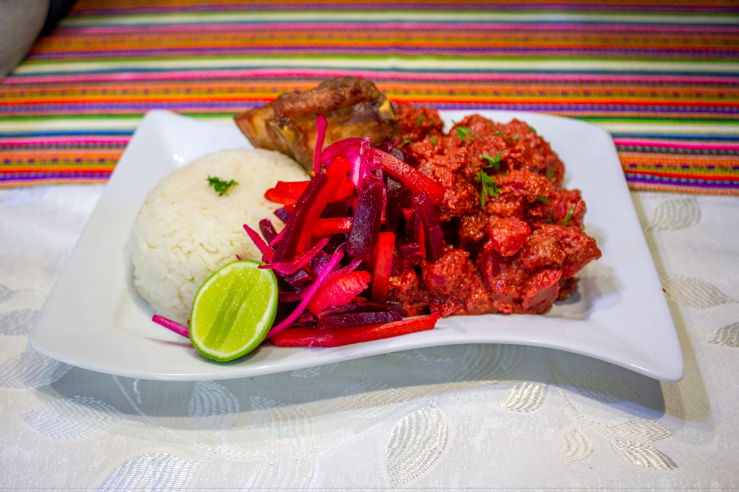 Adobo Ayacuchano: Carne de cerdo cocida lentamente con ají panca, cebolla, ajo, comino y pimienta, servido con papas y mote.